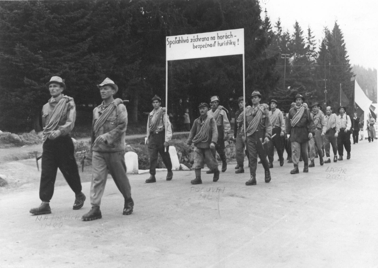 Tatranský záchranný sbor ve Vysokých Tatrách 1.5.1949, čtvrtý zleva pod transparentem je Janko Počúvaj.