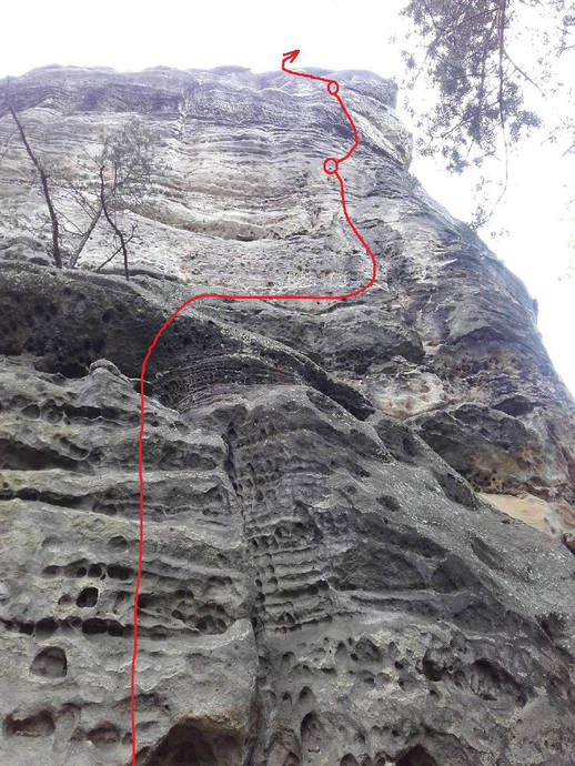 Pravou částí údolní stěny na balkon, vpravo sokolíkem a trhlinou k 1. kruhu. Jemnou stěnou vpravo do police ke kyzům a přímo ke 2. kruhu. Vlevo ke žlábku s trhlinou a přes poličky n. v.