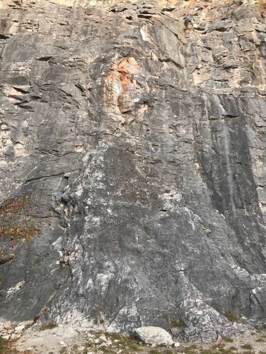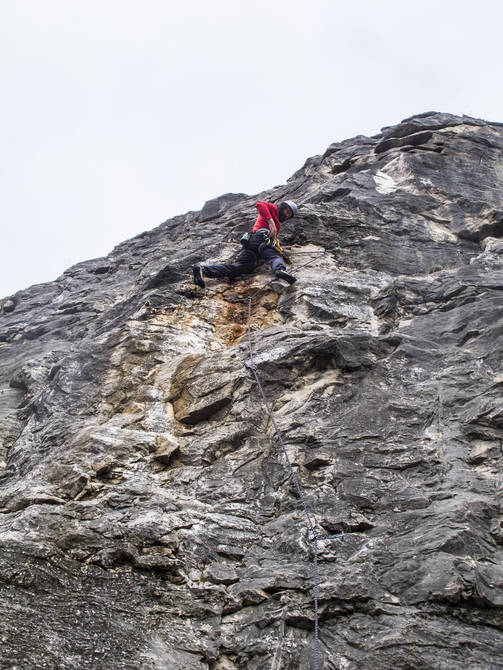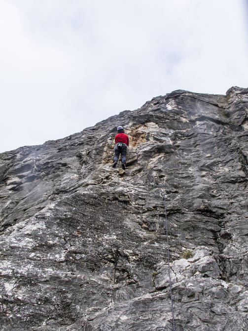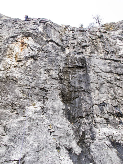 Pravou stranou pilíře, přes načervenalou stěnu a vlevo přes hranu ke slanění. Už je dost oleštěná