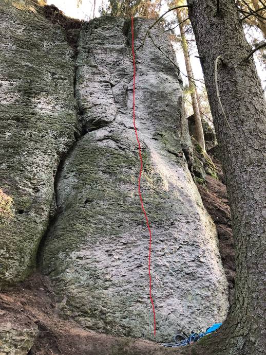 Krátkou stěnkou při pravé hraně po dírkách a drobných chytech ke sl. BH.