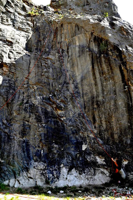 Koutkem vlevo vedle cesty Výstřik do tmy, přes tři nýty k slaňovacímu řetězu. 15m