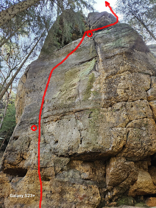 Od 1. K "Cesty cez rybičku" přímo stěnou nad zářez a šikmo vpravo pod střechu a dále přes 3. K "Cesty cez rybičku" n. t.