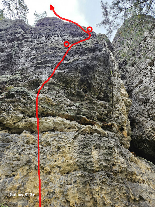 Vpravo od „Cesty bosorek“ přes balkónek k 1. K. Vpravo na hranu do spáry a jí ke 2. K. Ukloněnou plotnou n. t.