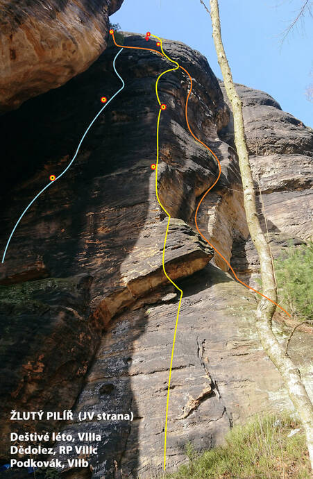 Mezi cestami Deštivé léto a Podkovák stěnkou a přes převis na polici ke K. Oblou hranou přímo přes 2. K na balkon (zde křížíme cestu Podkovák). Vzhůru přes převis (3. K) a pokládající se stěnou přes slaňovací BH na temeno.
