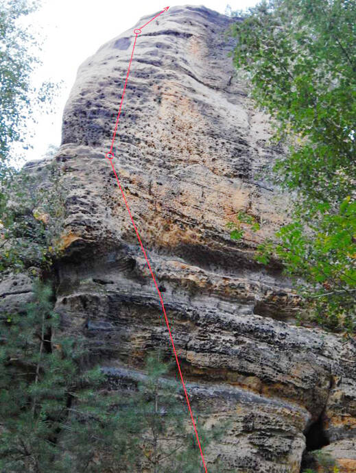 Od středu údolní stěny mírně vlevo až k výraznému hrotu a vzhůru k 1. K. Stěnou přímo ke 2. K a na vrchol.
