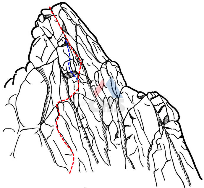 Z travnatéího balkónu v údolní stěně po lištách k borháku a prstovou spárou na polici (štand). Libovolně na vrchol.