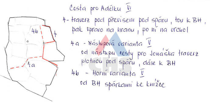 - Nástupová variant V: Od nástupu Cesty pro Jonáška traverz plotnou pod spáru, dále k BH.