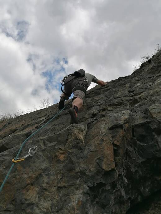 Pravou hranou na převis a dále ke slanění (4 bh).