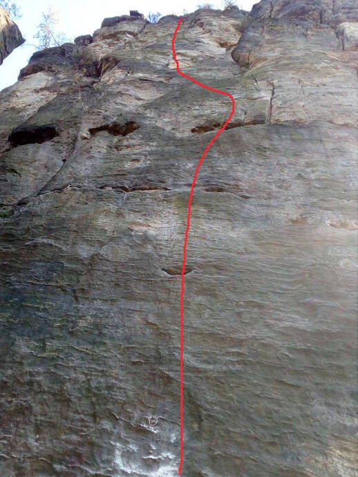 Vlevo od cesty Červená ještěrka stěnou přes 3 kruhy a dále šikmo vlevo (křížíme Chroustí cestu) ke 4. kruhu. Stěnou přímo na vrchol.
