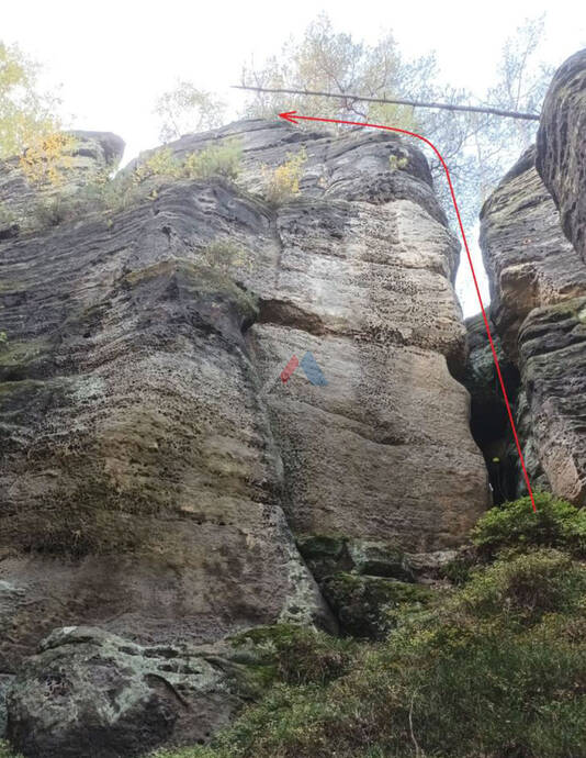 Komínem mezi „Vklíněnou stěnou“ a „Strážcem ostrohu“ a ukloněnou stěnou krátce n. t.
