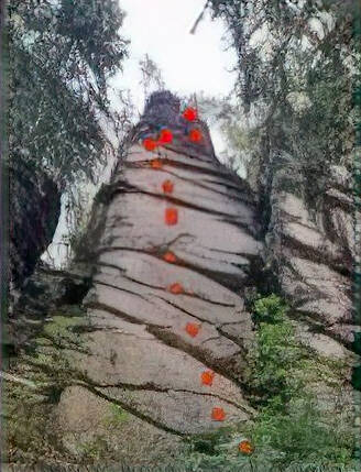 Údolní stěnou zprava (1. kruh) ke 2. kruhu. Mírně vlevo přes převis a doprava ke žlábku (3. kruh, knížka). Podél žlábku na temeno.