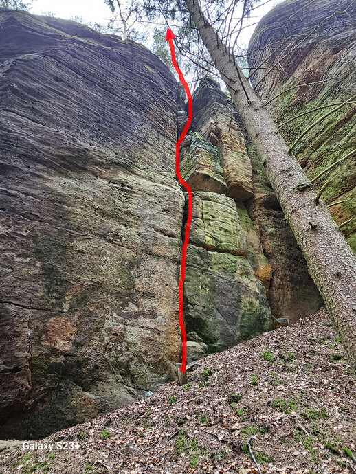 V pravé části údolní stěny levou spárou (smyčky) do komína a jím n. t.