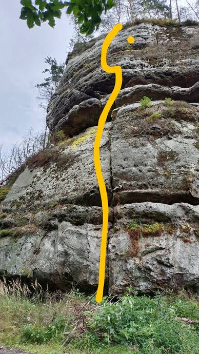 Z údolí spárou přes převis a stěnou ke K cesty Zelený Pepa.