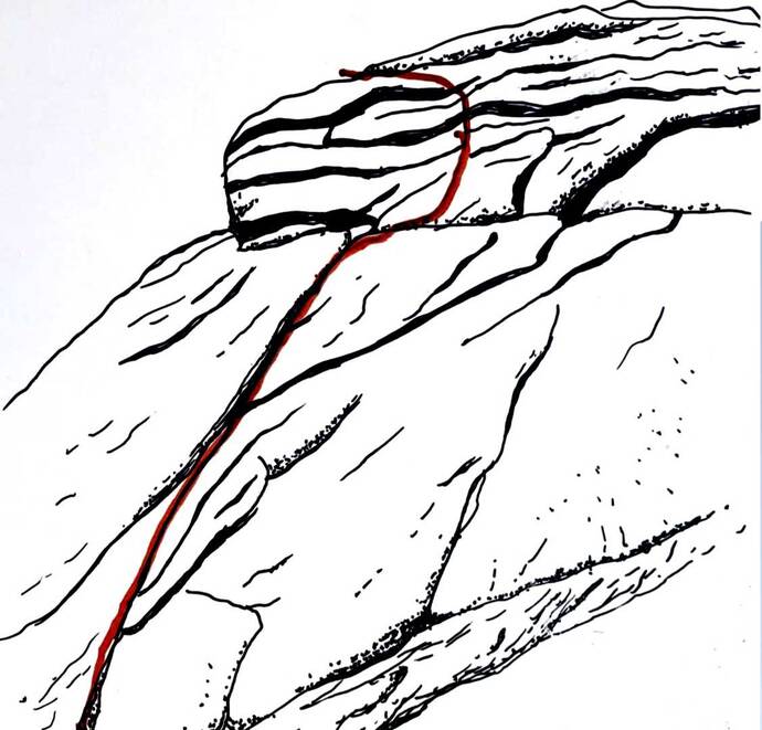 V levé části západní stěny spárou k BH. Dále přes horizontální spáry a výše vlevo na travnaté police a těmi na temeno.