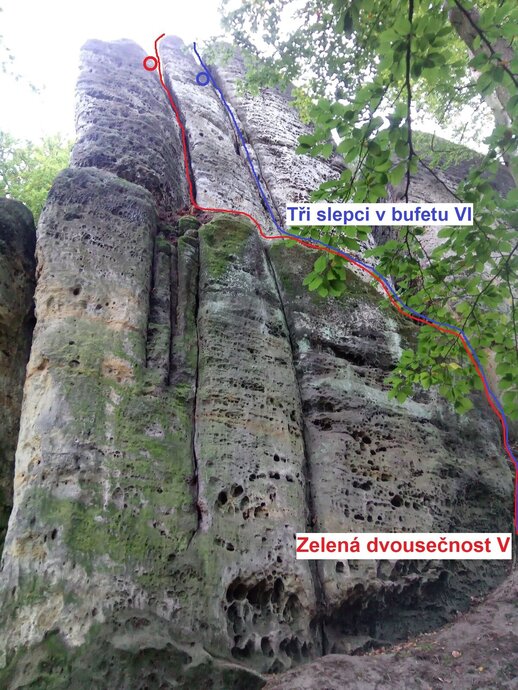 Z pravého boku krátce na balkon a po něm vlevo až ke dvěma trhlinám. Podél thlin (smyčky) přes kruh do komína a jím na temeno.