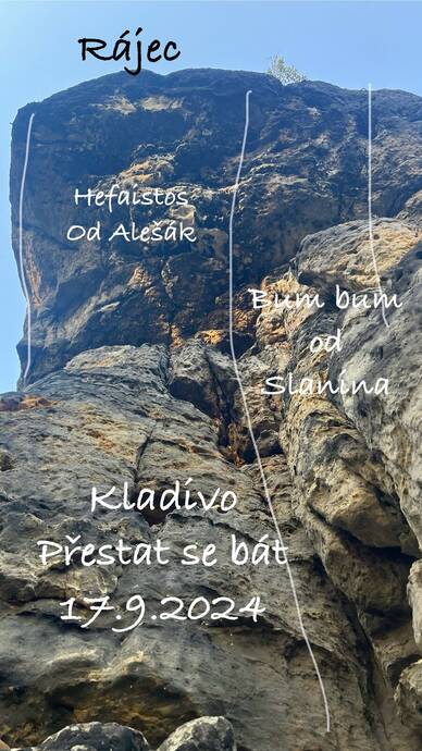 Koutem vlevo od cesty Buch buch pod strop , smyčky a největším převisem přímo a stěnou na vrchol . Poznámka : k bh vlevo nad stropem se traverzuje zleva z Rájecké paní