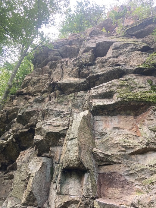 Ve středu stěny zprava podél nevýrazného pilíře, přes převislé poličky a položenou stěnkou (7 stříbrných bh) ke sl.