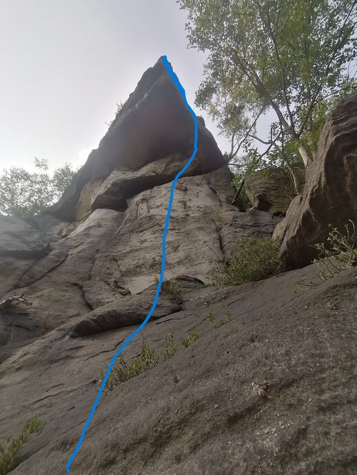 Vlevo od nástupu Bílého výlomu stěnou šikmo vpravo na polici. Stěnou (křížíme Bílý výlom) šikmo doprava pod velký převis k hodinám. Přes převis (BH) a šikmo vlevo stěnou na hranu a tou (nebo stěnou přímo) n.t.