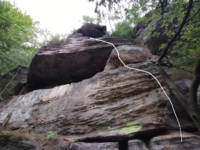 Vpravo ve střední části masivu (strom) stěnou mírně vlevo (6 BH) ke slaň. BH.