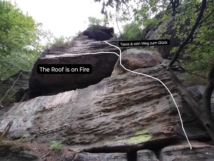 Od 2.BH cesty Tasos a jeho cesta ke štěstí vlevo hranou střechovitého převisu (4 BH) ke slaň. BH.