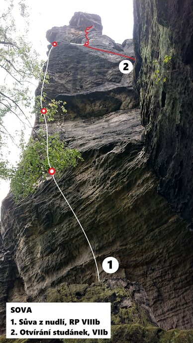 Vpravo od cesty Zetka z balvanu v koutě převislou stěnou, výše hranou (3 BH) přímo k 1. K Otvírání studánek. Spolu s Otvíráním ke 2. K. Nalevo středem stěny přímo ke sl.