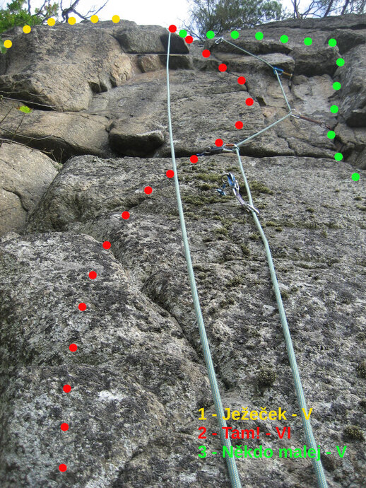 Nástup v levé části stěny, po výrazných oblých stupních k hladké plotně, podél jejího pravého okraje a přes malý převísek na polici, odtud přímo na balkon. Z balkonu středem velkého bloku k hornímu velkému bloku, na ten vyhoupnutím jeho středem a dále překrokem k vrcholové stěnce, zde středem a mírně doprava ke hraně po suchým lišejníkem zarostlých chytech na balkon a lehce na vrchol. Vrcholová stěnka se dá zajistit spíše morálově ve spodní části malým vklíněncem a malým uzlíkem.