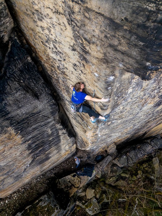 Vpravo od cesty Dešťový kout výraznou hranou (4 BH) k převisu. Doprava do cesty Buď fit a tou ke slaň. BH.
