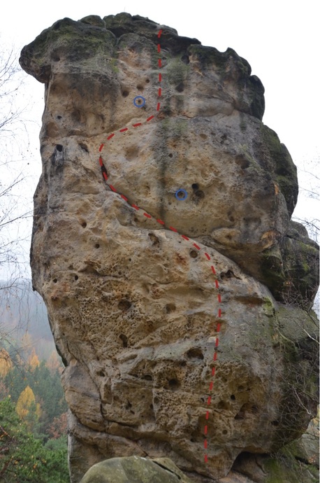 Středem převislé S stěny na šikmou lavici, po ní vpravo, poté šikmo doleva a vzhůru do zářezu (smyčka), vzhůru a traverz doprava ke kruhu. Šikmo vpravo na vrchol.