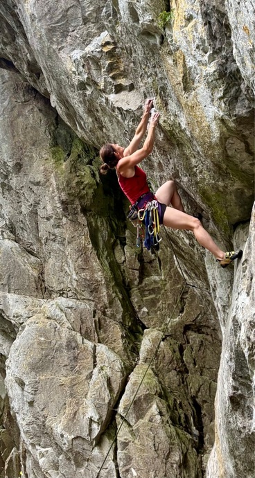 Traverz zprava po balkonu a na hranu. Nahoře doprava do plotýnky a přes menší převis nv.