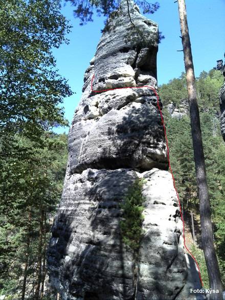 J hranou na plošinu, zprava přes převis a hranou do výklenku (slaňovací kruh). Traverz vlevo a komínem na vrchol.