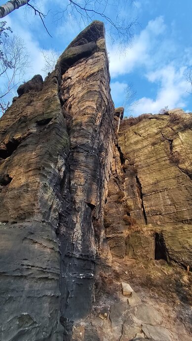 Vpravo od údolní JZ hrany stěnou podél sokolíků a stěnou (K) do římsy pod převis. Přímo stěnou n. v.