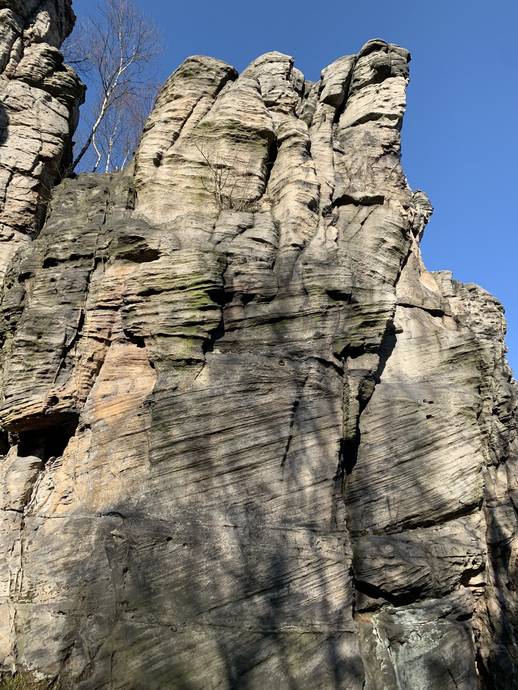Převislým pilířkem vpravo v Z stěně přes římsy ke K. Vpravo převislou hranou n. v.