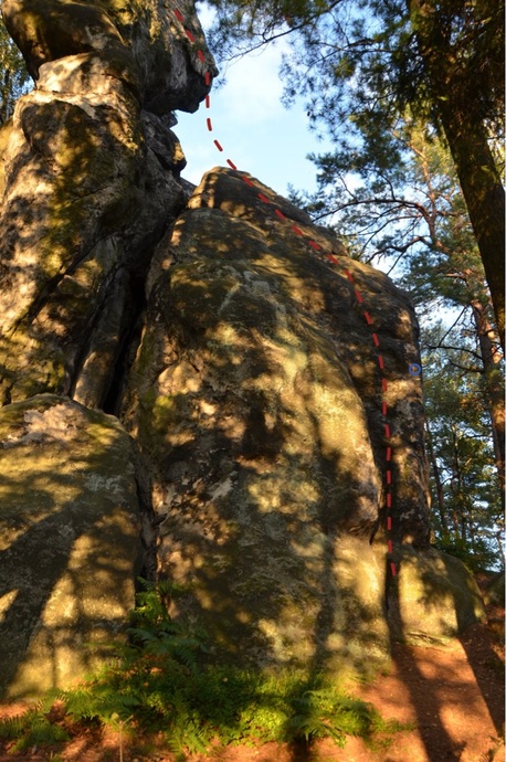 Od JZ spárou, šikmo vlevo na předskalí a převislou stěnkou šikmo vlevo na vrchol.