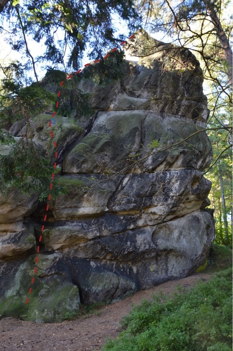 Vlevo v JV stěně komínem ke kruhu, (post. ) a širokou spárou na hřbet a po něm (post. ) na předvrchol.