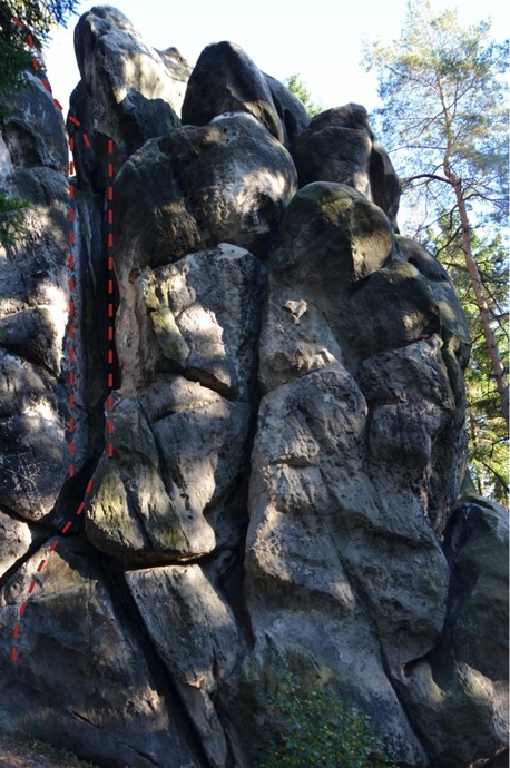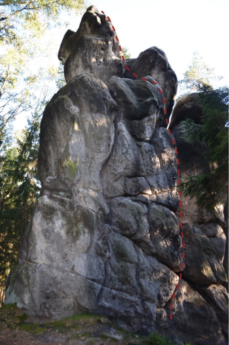 Komínem uprostřed Z stěny na polici (sl. kruh), na předvrchol a překrok na vrchol.