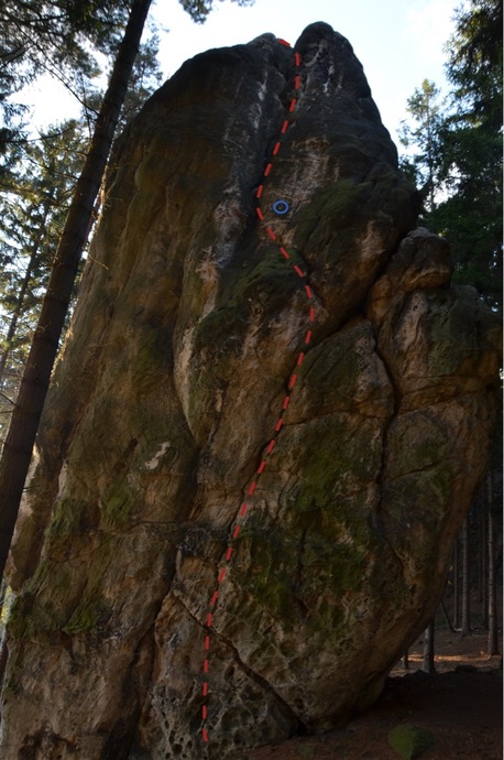 Vpravo ve V stěně stěnou do díry (smyčka hluboko v díře), doleva ke kruhu a žlabem na vrchol (nahoře též lehčeji zleva). pozn. : prvovýstup nahoře pomocí skoby