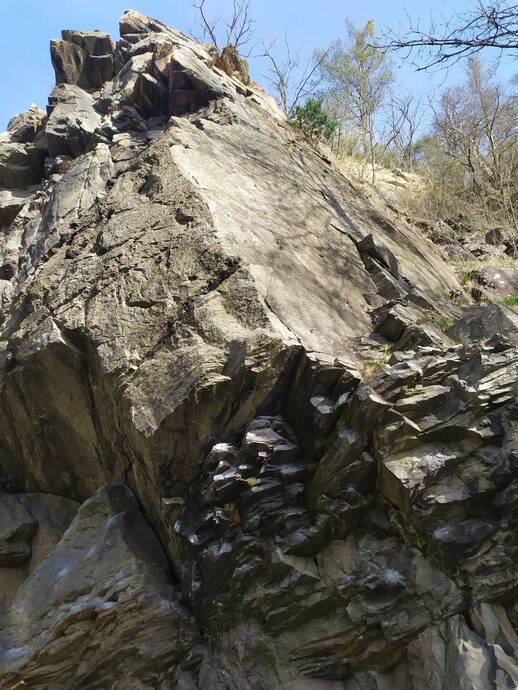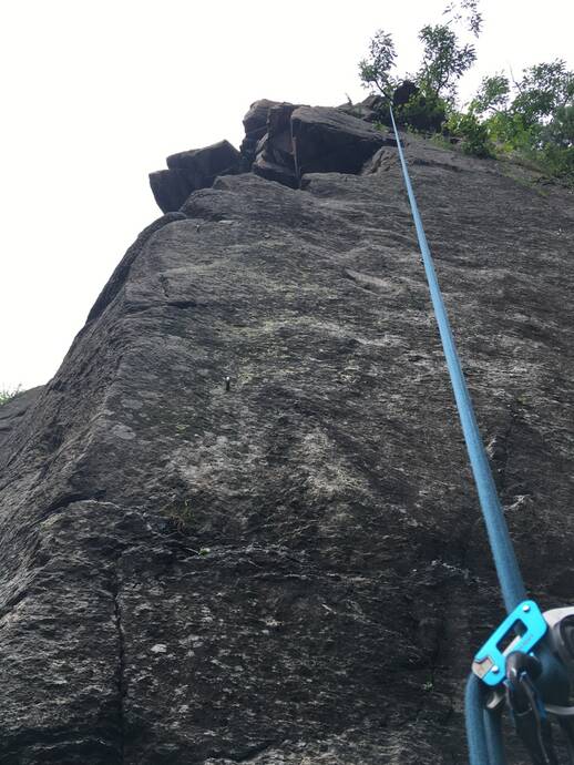 Koutem v pravé části dolního černého převisu na balkón s nýtem a po jižní hraně přes dva borháky k nýtu Jedničkové cesty" a jí na vrchol. "