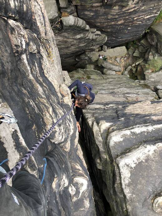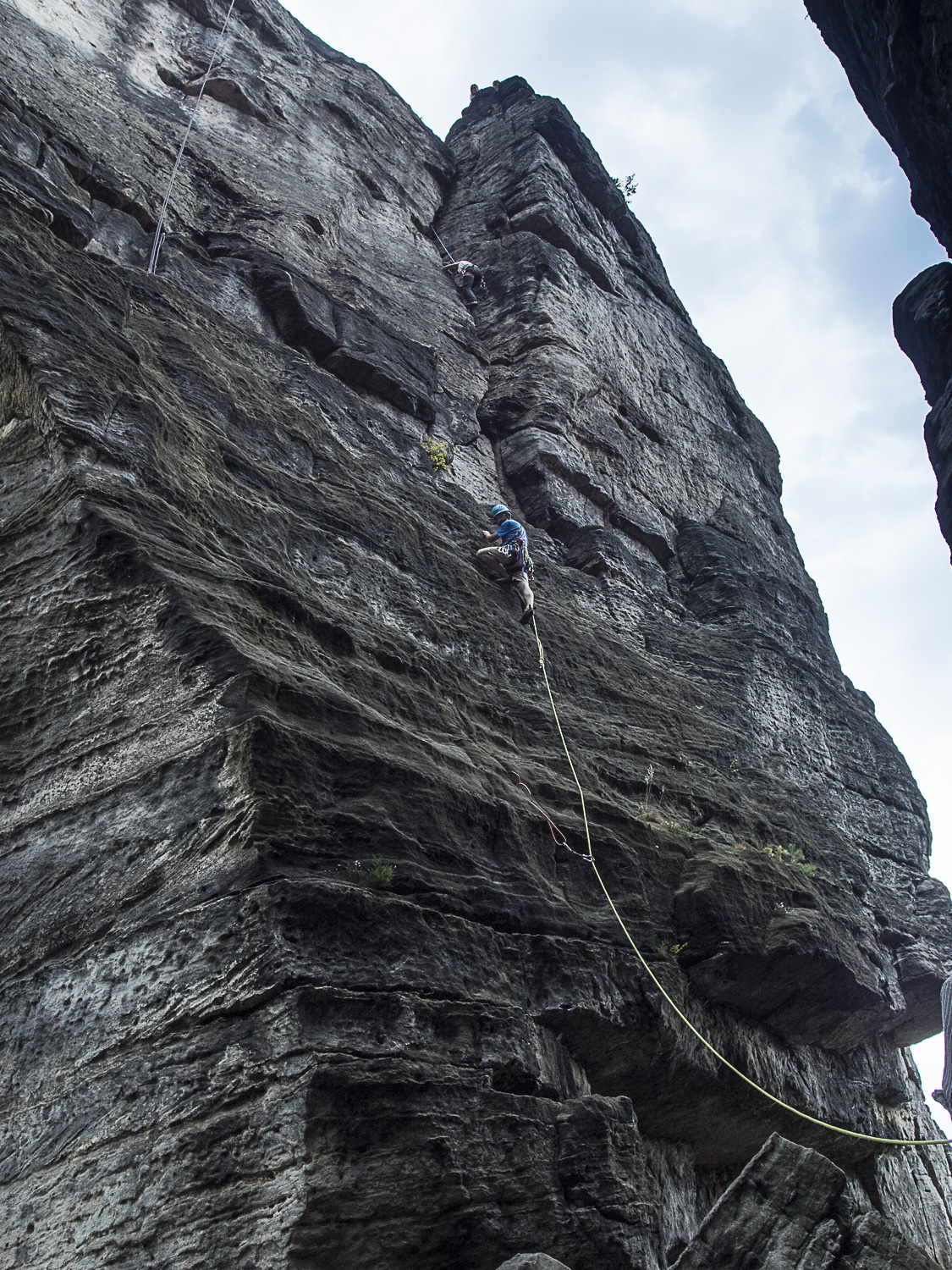 JV stěnou k širokému pásu, doprava ke kruhu a spárou (jištění za vklíněný kámen) na vrchol.