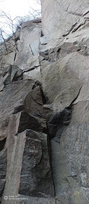 Na začátku levé stěny vhloubení nástup přes schodovité stupně, kolmou stěnkou na římsu a podél spáry na plošinku na vrcholu odštípnutého bloku.