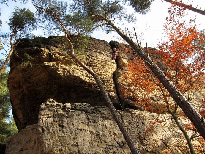 V levé části velké Z stěny masivu stěnkou k výrazné spáře a jí přes 2 K n. t.