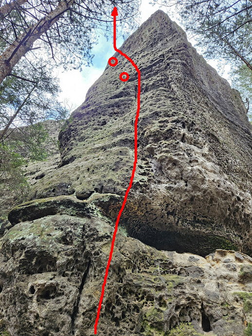 Z údolní strany vpravo od komína, stěnou k 1. K. Šikmo doleva ke hraně ke 2. K a přímo n. v.