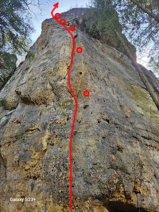 V pravé části severní stěny k 1. K, přes převis do spáry, jí ke 2. a 3. K, dále vzhůru pod převis, vlevo ke 4. K, šikmo vlevo k 5. K a n. v. přilehlého bloku.