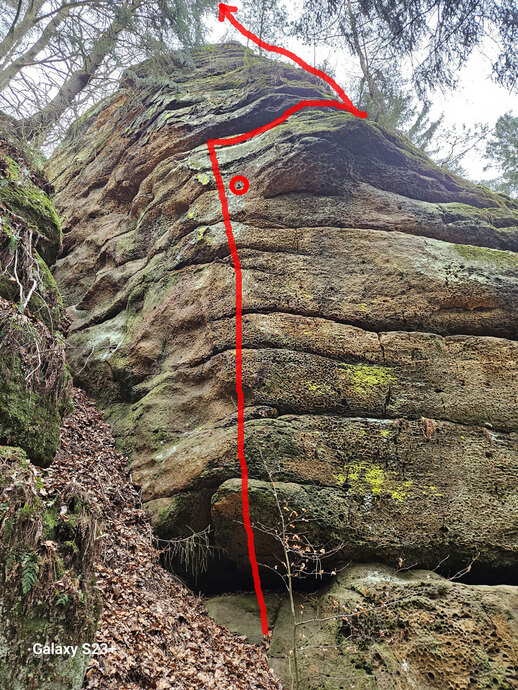 Vlevo v údolní stěně nevýraznou hranou ke K, vzhůru na římsu, doprava k borovici a šikmo n. v.