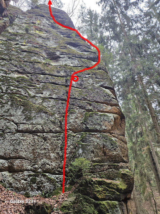 Spárkou v severní stěně k 1. K. Doprava na hranu a po ní ke 2. K pod převis, zleva n. v.