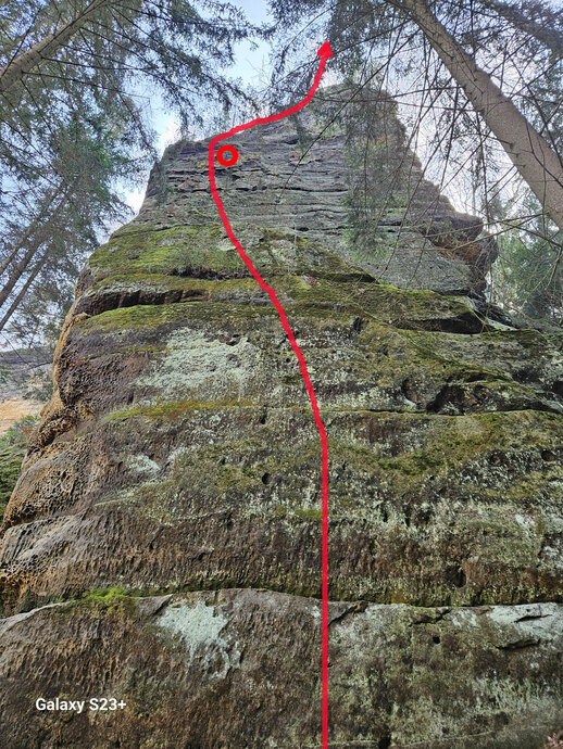 Středem stěny vzhůru k železitým chytům a doleva ke K, vzhůru a hranou n. t.