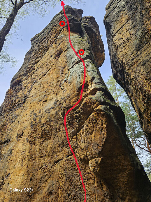 Vlevo od levé náhorní (JV) hrany stěnou k převislému sokolíku, jím na hranu a výše k 1. K. Hladkou plotnou šikmo doleva ke 2. K a šikmo n. v.
