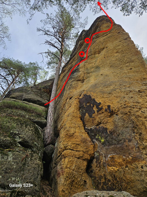 Z předskalí v severní stěně traverz po římse doprava k 1. K. Přímo ke 2. K, doprava na hranu a po ní n. t.