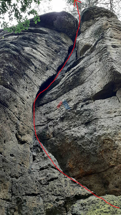 Zářezem v údolní stěně asi 8 m vzhůru, traverz doprava a spárou rozšiřující se v komín na plošinu, přímo nebo doleva vzhůru n. v.