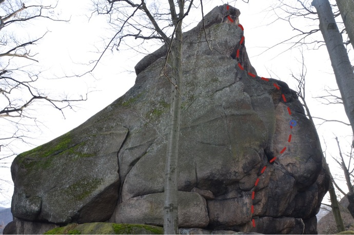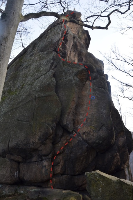 Vpravo od Kauschkovy cesty přímo do kouta výlomu (skoba) a vpravo výšvihem na polici (K). Libovolně na vrchol.