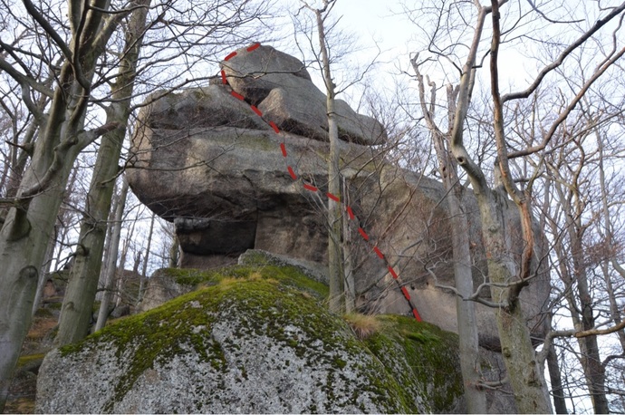 Z údolní strany šikmou spárou (1. K), vlevo (nýt) na odštěp, plotnou do Spirálové cesty. Z té vpravo ke 2. K, plotnou mírně vpravo k liště (vpravo jištění) a šikmo vlevo na vrchol.